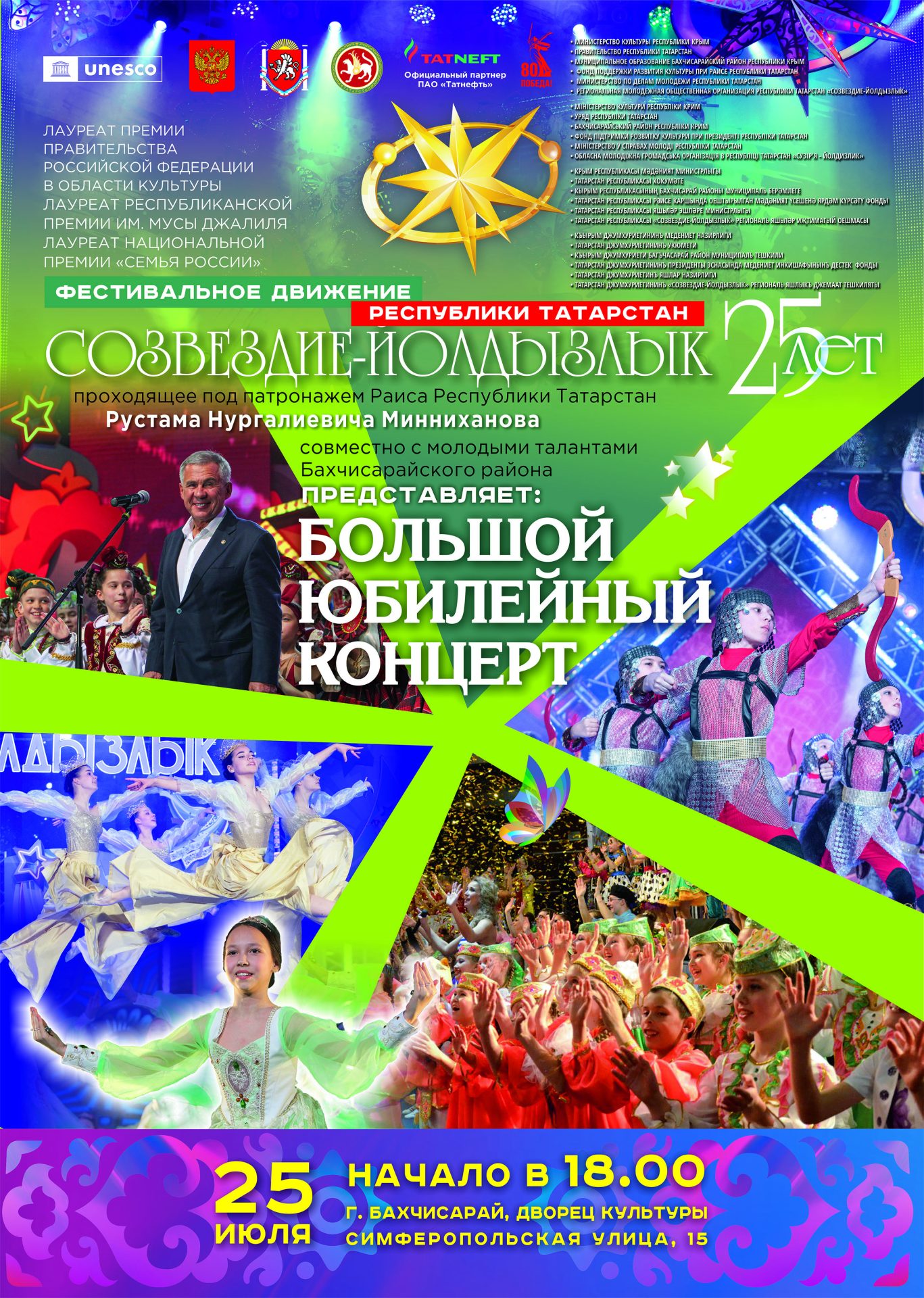 25 июля 2025 года в Бахчисарайском районном Доме культуры состоится большой юбилейный концерт лауреатов фестиваля эстрадного искусства «Созвездие-Йолдызлык», проходящего под эгидой Комиссии Российской Федерации по делам ЮНЕСКО, и молодых талантов Бахчисарайского района.