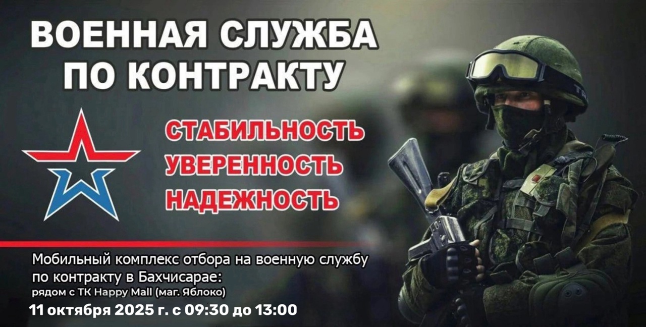 11 октября 2025 года с 09:30 до 13:00 в Бахчисарае рядом с ТК Happy Mall (магазин Яблоко) будет работать мобильный комплекс отбора на военную службу.